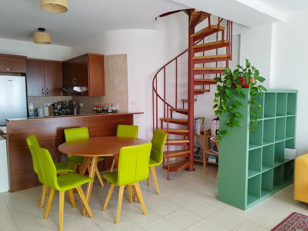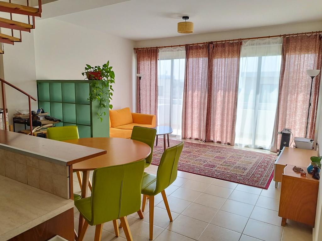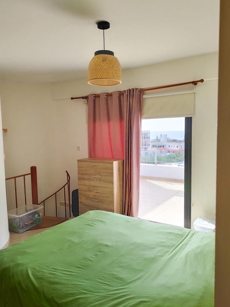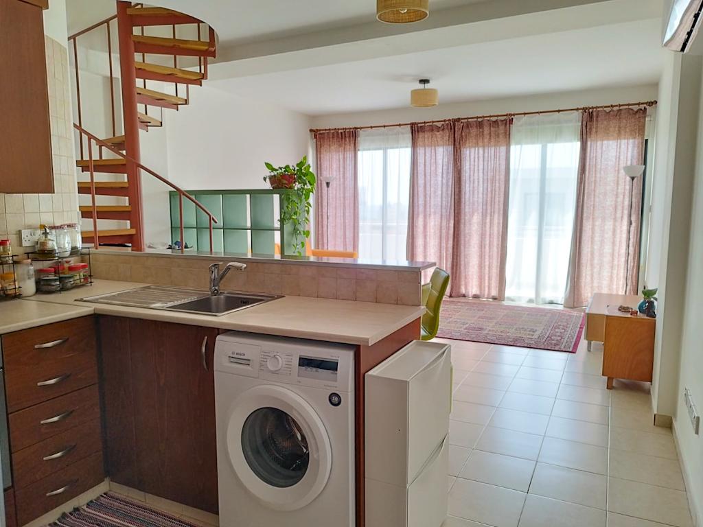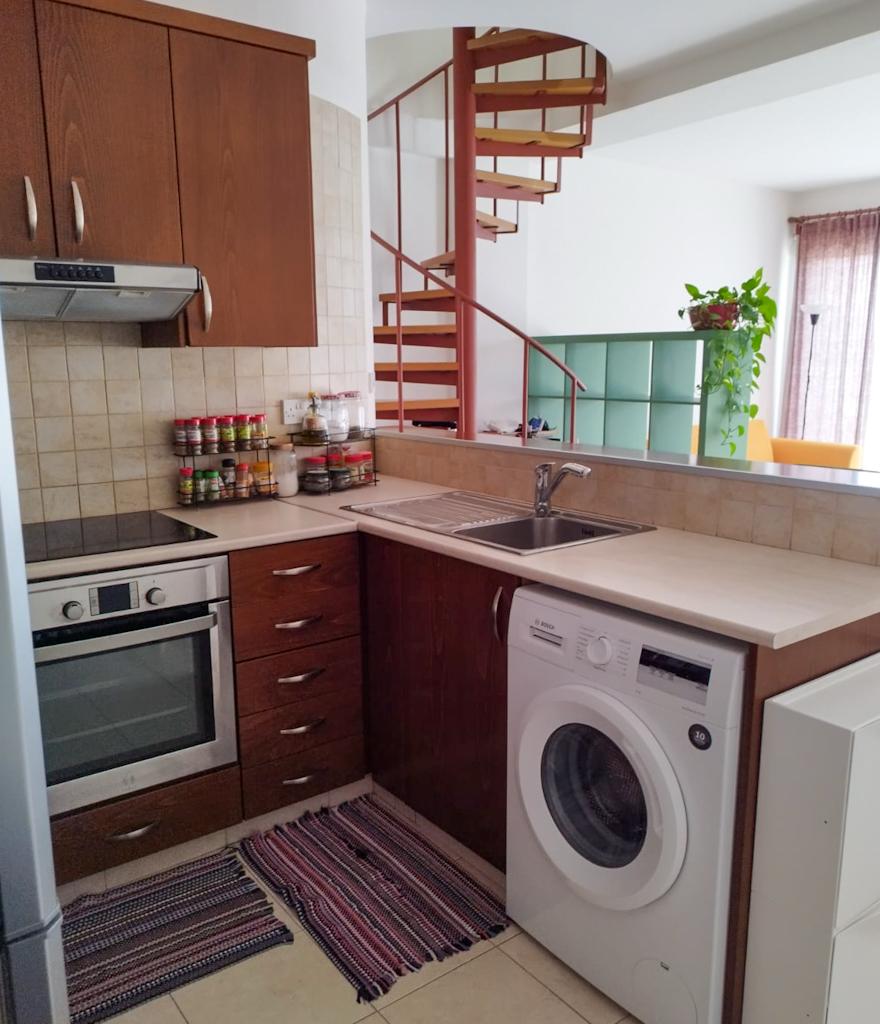 This charming two-story apartment offers comfort and convenience in Pano Paphos, close to all amenities. The first floor features an open-plan kitchen and living area, a guest WC, and a small balcony. The second floor includes a spacious bedroom, a bathroom with a shower, and a large balcony. Fully equipped for a hassle-free move-in, the apartment is within walking distance of the city center and essential services. Free parking is available next to the building, and communal fees are €20 per month.