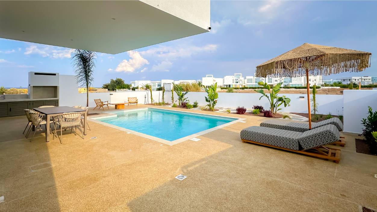 New 3-bedroom, 2-bathroom villa in the heart of Protaras, designed with island chic architecture and high-quality finishes. Enjoy a private swimming pool, gated entrance, and a beautifully landscaped garden with a BBQ area for perfect outdoor gatherings. The villa features spacious verandas (30sqm covered) and outdoor living areas, ideal for relaxing in style. With a plot area of 262sqm and covered space of 132sqm, this home offers comfort and elegance. Plus, ample parking space ensures convenience.