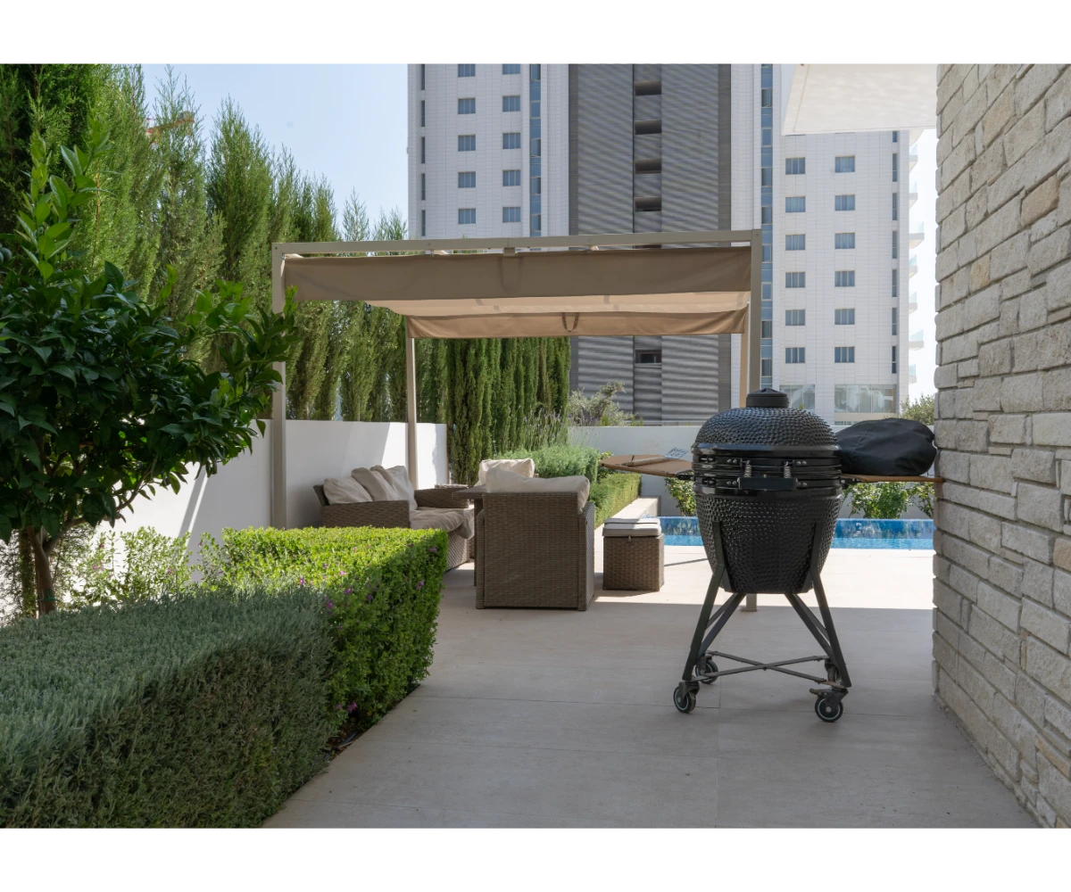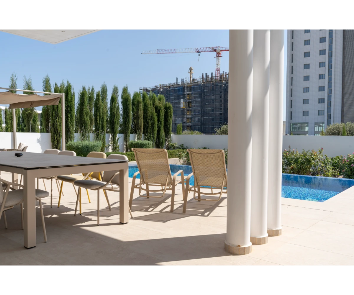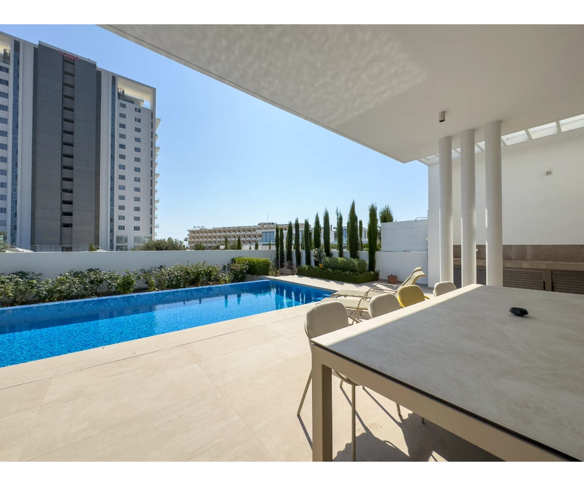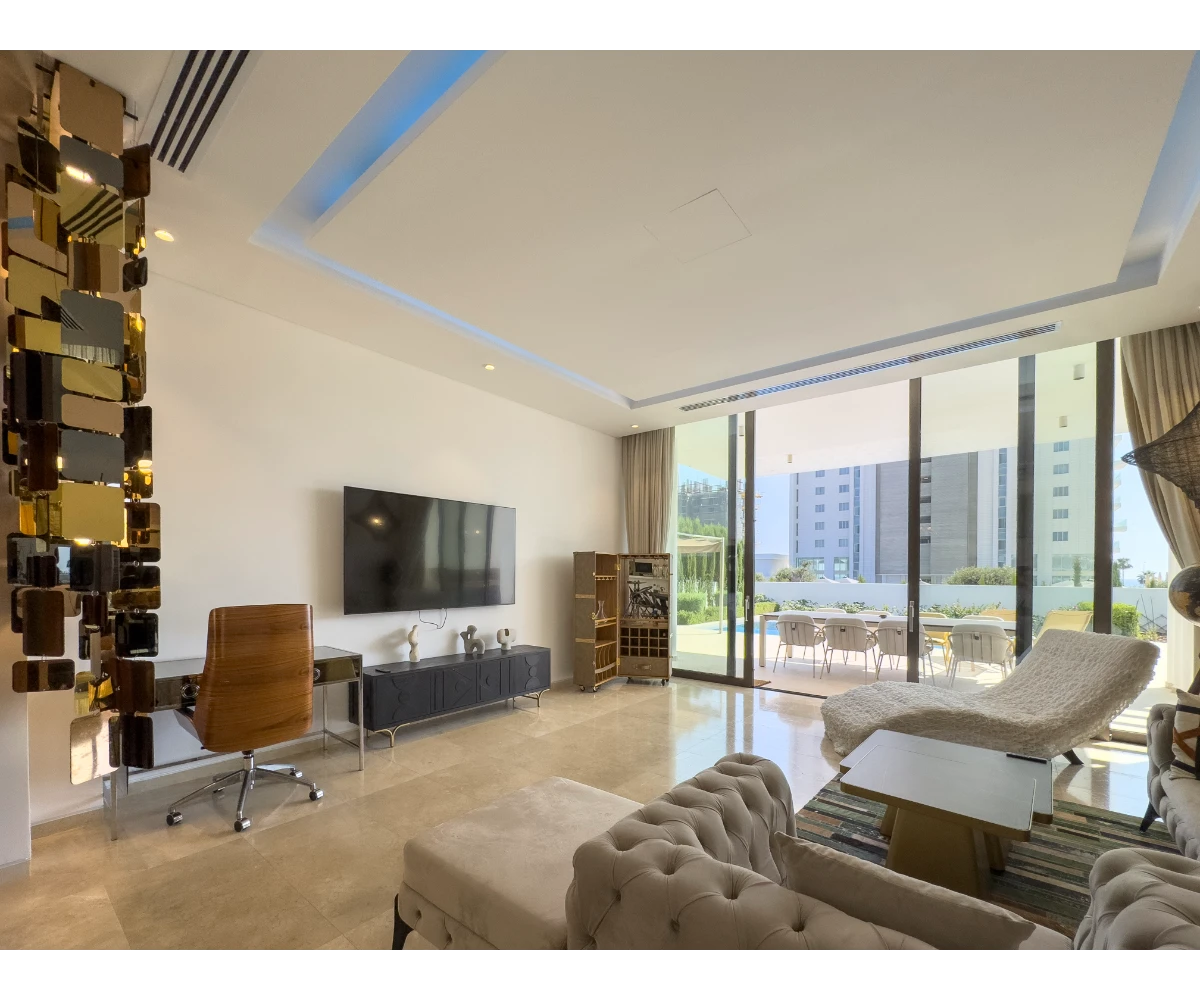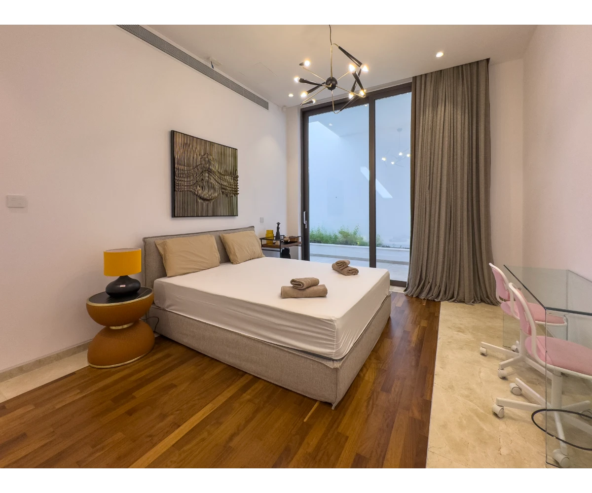 Located in the heart of Kato Paphos, just 200m from the beach, this 5-bedroom detached villa offers 330m² of luxury on a 468m² plot. It features marble floors, high ceilings, an elevator, spacious open-plan areas, a modern kitchen, and en-suite bedrooms. Outdoors include a private pool, landscaped courtyard, BBQ area, verandas, plus access to a communal pool. Smart home system, photovoltaic panels, and underfloor heating ensure year-round comfort. Part of an exclusive gated community with premium amenities, it is within walking distance to nightlife, schools, universities, services, the historic castle, and the picturesque harbour – yet set in a quiet area away from the main road.