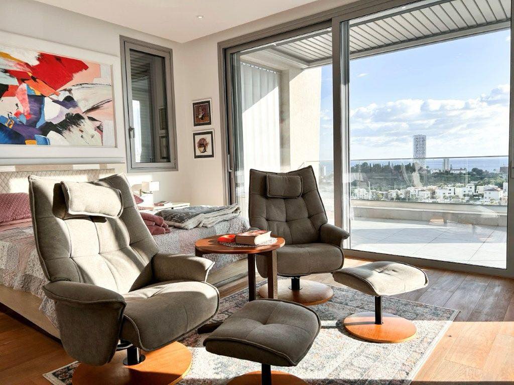 מטבח מרווח ואזור מגורים הפתוחים למרפסות גדולות עם נוף עוצר נשימה לים ולבריכה.